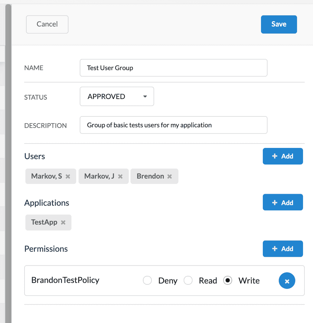 | Permissions | Use the + Add button to add existing policies (permission sets) that should apply to this group. Once you add a policy, you must also specify whether the group is granted the READ, WRITE, or DENY access level for that policy. Alternatively, to remove a policy, click X to the right of the user. |