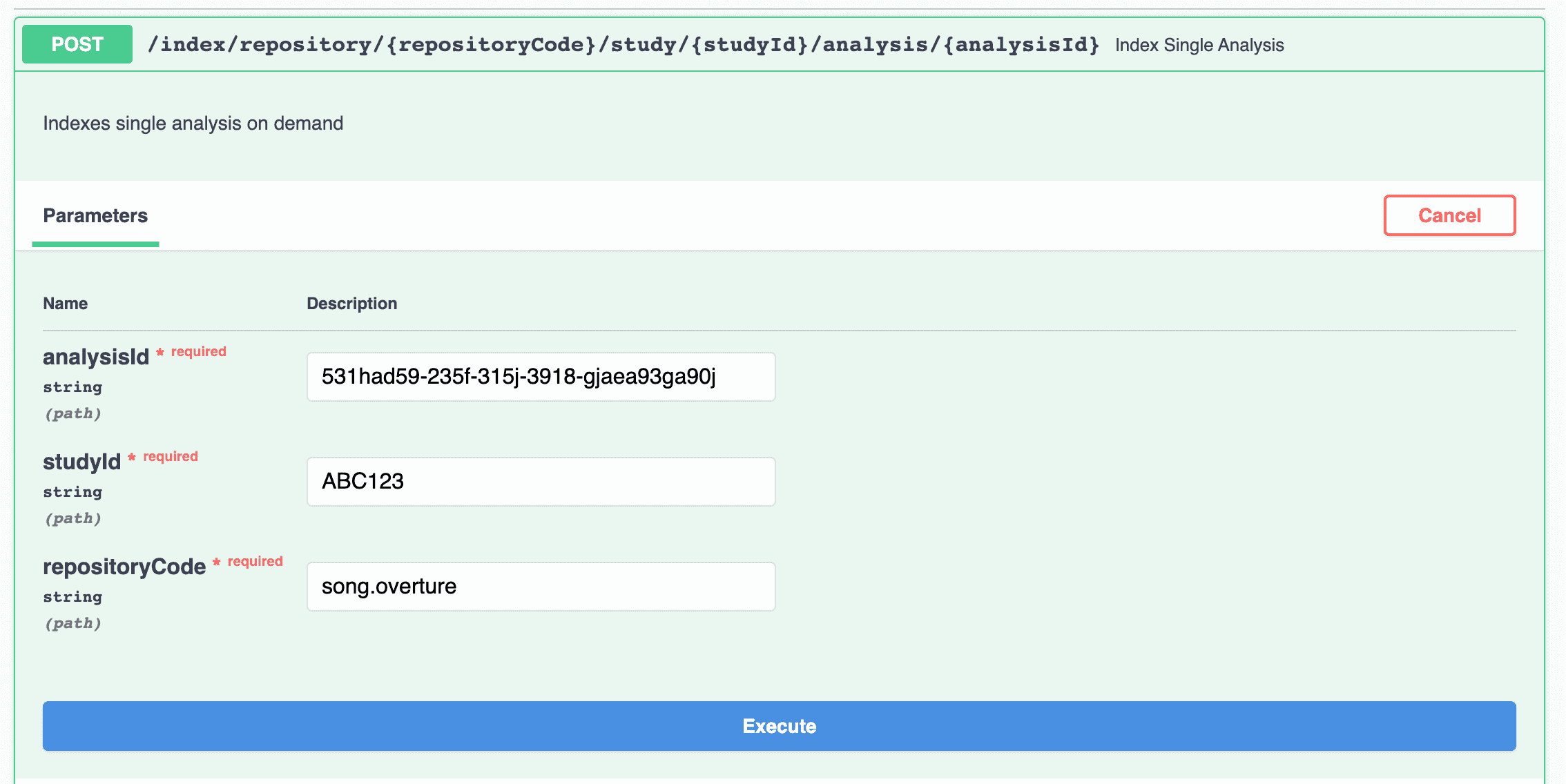 repositoryCode is the code representing the Song repository that the study belongs tostudyId is the ID of the study that the analysis belongs toanalysisId is the ID of the analysis you want to indexTo index a study using the Swagger UI: